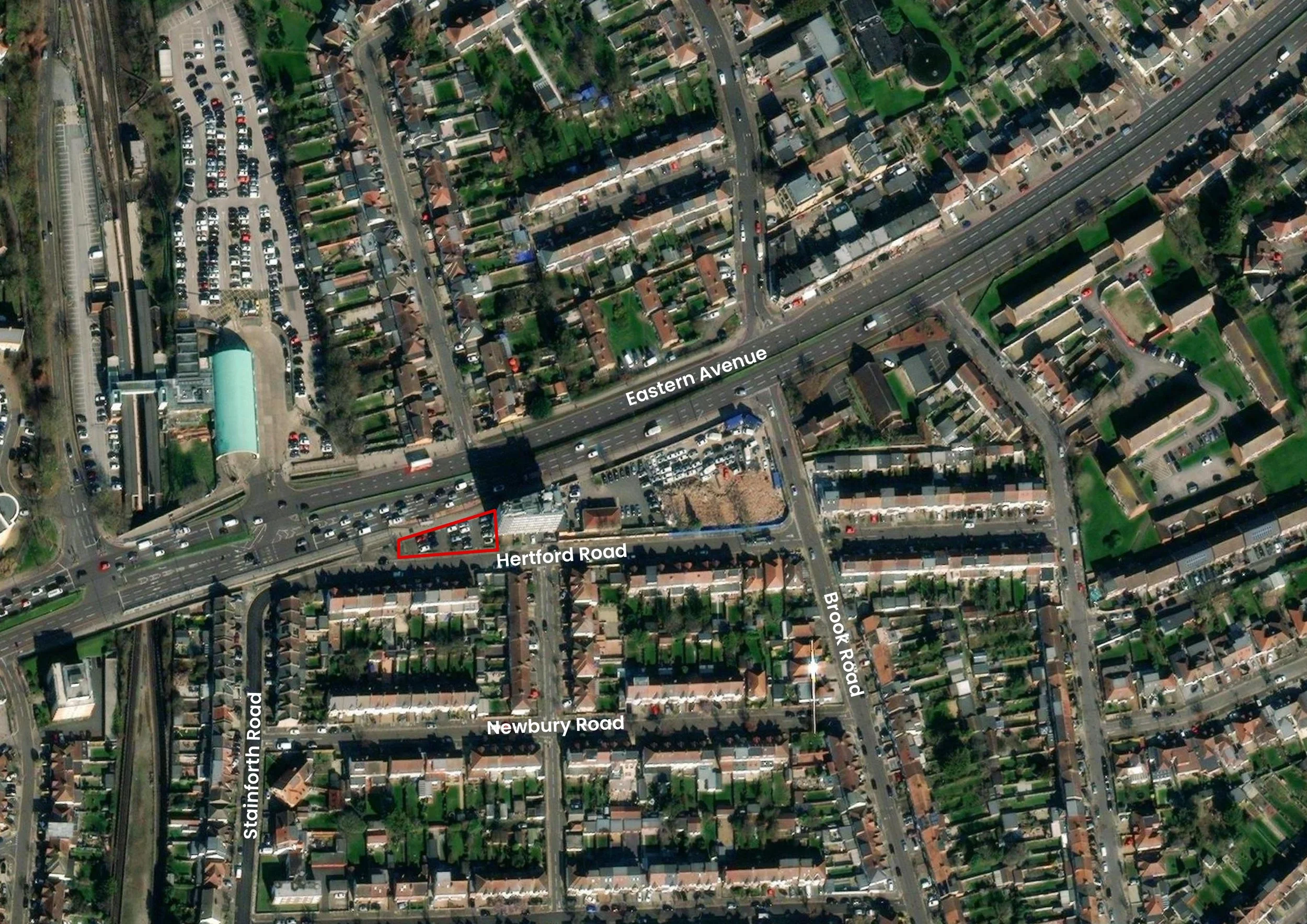 The Brook House site sits directly beside Newbury House on Eastern Avenue, adjacent to Newbury Park Underground Station. To the east stands Newbury House, a larger mixed-use building that is entirely separate to this application. It is bound by Hertford Road to the south and west, while the north side faces Eastern Avenue itself.